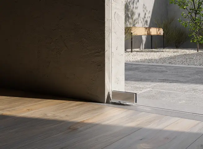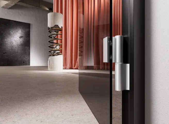 La cerniera pivot per porte in vetro pesanti a doppio battente ha un design elegante e minimalista. Il portfolio comprende anche cerniere completamente nascoste per strutture di stanze a filo e concede libertà di design in edifici residenziali sofisticati.