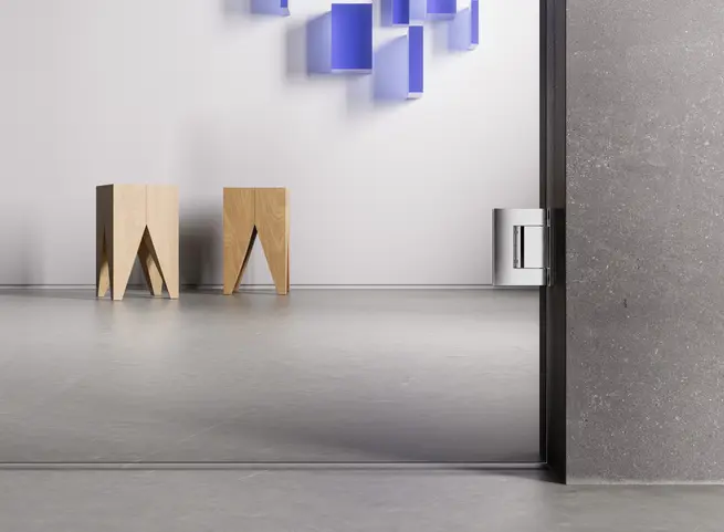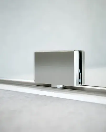 COLLIO è un sistema di cerniere oleodinamiche dal design minimale, progettato specificamente per porte in vetro in ambienti interni e box doccia. Grazie alla tecnologia integrata, permette la chiusura automatica e controllata dell'anta, eliminando la necessità di chiudiporta esterni o ingombranti sistemi a pavimento.